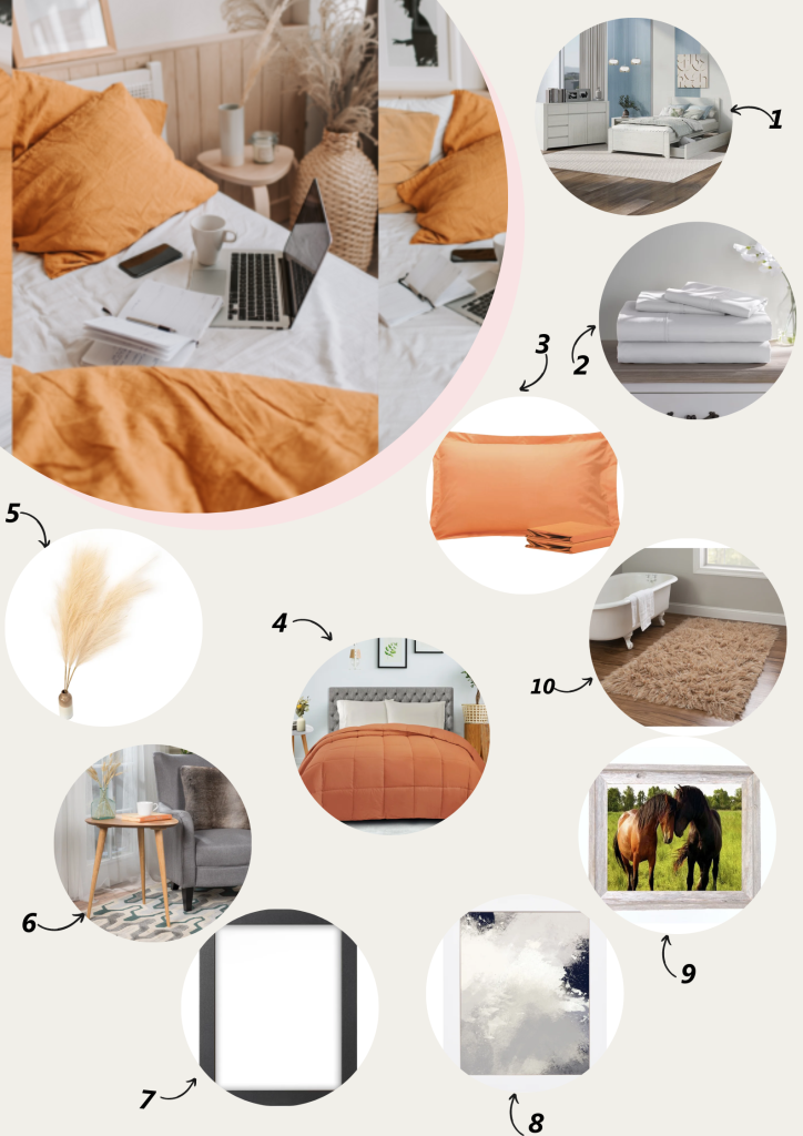 Start by upgrading your bedroom furniture with the Gracie Oaks 3-Piece Off-White Simple-Style Manufactured Wood Bedroom Set. This elegant and timeless set includes a twin bed, nightstand, and dresser. Choose bedding with a cohesive look that instantly enhances your space. Such as the bedsheet, a pillowcase set matching my burnt orange comforter. Add a touch of nature to your bedroom with the Decorative Bamboo Vase; I outsourced this vase you guys can find it near your locality. Its organic shape and natural texture bring any room a sense of calm and tranquility. Place it on your dresser or nightstand and fill it with fresh or faux pampas grass for a pop of color. The George Oliver Kamile End Tablecombines style and functionality. Its sleek design and spacious surface make it perfect for displaying your favorite books, candles, or a cup of tea. Place it next to your bed for easy access to your nighttime essentials. Personalize your space with these frames; wooden, white, black. Showcase your cherished memories by displaying your favorite photos in this charming and rustic frame. Hang it on your wall or your bedside table for a heartwarming touch. Complete your bedroom look with the cozy and luxurious Wade Logan Alamin Handmade Flokati Wool Light Brown Area Rug. It has a soft texture and neutral color creating a warm and inviting ambiance, adding comfort and style to your space. To summarize, you can transform your bedroom into a space that reflects your unique style and promotes relaxation. So, explore new designs and ideas, mix and match these handpicked pieces, and create a bedroom that brings you joy and serenity every time you enter.